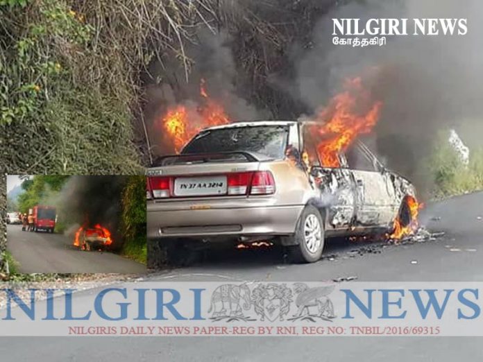 கோத்தகிரி 23 September 2018 :கோத்தகிரி ,தட்ட பாலம் அருகே வந்து கொண்டிருந்த கார் . இயந்திரக் கோளாறு காரணமாக திடீரென தீப்பற்றி கொண்டது காரில் பயணம் செய்த 4 பேர் அதிர்ஷ்டவசமாக உயிர் தப்பினர் . தகவலின்பேரில் தீயணைப்புத் துறையினர் சம்பவ இடத்திற்கு வந்து தீயை அணைப்பதற்கு கார் முற்றிலும் சேதமடைந்தது இதனால் அப்பகுதியில் சிறிது நேரம் போக்குவரத்து பாதிப்பு ஏற்பட்டது.– Nilgiri News