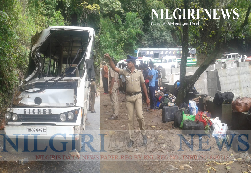 Coonoor 09 October 2018 : நீலகிரி மாவட்டத்தில் கன மழை பெய்யும் என Red Alert விடுக்கப்பட்டிருந்த இருந்தது. இதற்காக உதகைக்கு TNTRF காவல்துறையினர் பாதுகாப்பு பணிக்காக வந்தனர். Red Alert திரும்பப் பெற்ற நிலையில் ,பணியை முடித்து திருநெல்வேலி திரும்பிச் சென்றபோது குன்னூர் மேட்டுப்பாளையம் நடு சாலையில் வாகனம் கவிழ்ந்து விபத்துக்குள்ளானது. இதில் பயணம் செய்த 33 பேர் அதிர்ஷ்டவசமாக உயிர் தப்பினர். இந்த விபத்தில் காயமடைந்த இரண்டு பேரை, சிகிச்சைக்காக மேட்டுப்பாளையம் அரசு மருத்துவமனைக்கு அனுப்பிவைத்தனர் .இந்த விபத்தினால் அப்பகுதியில் சிறிது நேரம் போக்குவரத்து பாதிப்பு ஏற்பட்டது – Nilgiri News