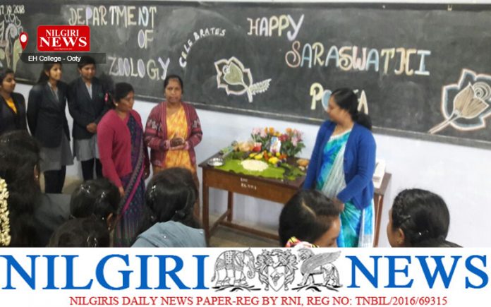 Ooty 18 October 2018 :உதகை எமரால்டு ஹைட்ஸ் மகளிர் கல்லூரியில் விலங்கியல் துறை சார்பாக சரஸ்வதி பூஜை சிறப்பாக கொண்டாடப்பட்டது .கல்லூரி முதல்வர் முனைவர் பார்வதி முன்னிலைவகித்தார். விலங்கியல் துறைத் தலைவர் முனைவர் ச.மகேஸ்வரி சிறப்பாக ஏற்பாடு செய்திருந்தார் .முனைவர் ஜி தனலட்சுமி எம்.சி. நிஷா மற்றும் கல்லூரி மாணவிகள் இந்த பூஜையில் கலந்து கொண்டனர் .– Nilgiri News
