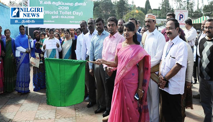 Udhagamandalam 19 Novermber 2018 : நீலகிரி மாவட்டம் உதகை மத்திய பேருந்து நிலையத்தில் இன்று உலக கழிப்பறை தினத்தை முன்னிட்டு விழிப்புணர்வு பேரணியை மாவட்ட ஆட்சித்தலைவர் திருமதி.ஜெ.இன்னசென்ட் திவ்யா அவர்கள் கொடியசைத்து துவக்கி வைத்தார். இந்நிகழ்ச்சியில் மாவட்ட வருவாய் அலுவலர் திரு.ப.செல்வராஜ், மாவட்ட ஊரக வளர்ச்சி முகமை திட்ட இயக்குநர் திரு.பாபு, உதகை கோட்டாட்சியர் திரு.சுரேஷ், நகராட்சி ஆணையாளர் திரு.நாராயணன், வட்டார வளர்ச்சி அலுவலர்கள் திரு.ராமன், திரு.நாகராஜன், திரு.ரமேஷ்கிருஸ்ணன், திருமதி.கோல்டிசாராள், திரு.நந்தகுமார், திரு.ஜனார்த்தனன், திரு.மோகனகுமாரமங்கலம், அரசுத்துறை அலுவலர்கள், மகளிர் சுய உதவி குழுவினர், பொதுமக்கள் உட்பட பலர் கலந்து கொண்டனர்..- Nilgiri News