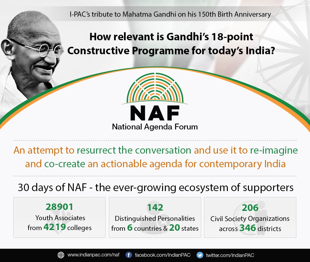 Indian Political Action Committee (I-PAC) launched the National Agenda Forum (NAF) as a tribute to Mahatma Gandhi on his 150th birth anniversary year on 29th June 2018. NAF is a pan -India initiative to resurrect the conversation around Gandhiji’s 18-point Constructive Programme and use it to re-imagine and co-create India’s priorities to formulate an actionable agenda for contemporary India.