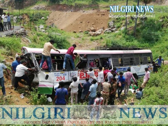 தெலுங்கானா 11 September 2018 : 86 பயணிகளுடன் சனிவாரம்பேட்டா இருந்து ஜகித்தியால் நோக்கி சென்று கொண்டிருந்த தெலுங்கானா அரசு பேருந்து .ஜகித்தியால் அருகே வந்தபோது இரும்புத் தடுப்பை உடைத்து பள்ளத்தில் விழுந்து விபத்துக்குள்ளானது. இதில் 53 பேர் பலியானார்கள், காயமடைந்தவர்களை கரீம்நகர் மற்றும் ஜகித்தியால் அரசு மருத்துவமனைக்கு அனுப்பிவைத்தனர் ,60 பேர் மட்டுமே பயணம் செய்யக்கூடிய இந்த பேருந்தில் அளவுக்கு அதிகமான பயணிகளை ஏற்றிச் சென்றது ஒரு காரணமாக கூறப்படுகிறது. அதிக வேகத்தில் இந்த பேருந்து வந்ததாக விபத்தில் நேரில் பார்த்தவர்கள் தெரிவித்தனர், இது குறித்து காவல்துறையினர் விசாரணை நடத்தி வருகின்றனர்.