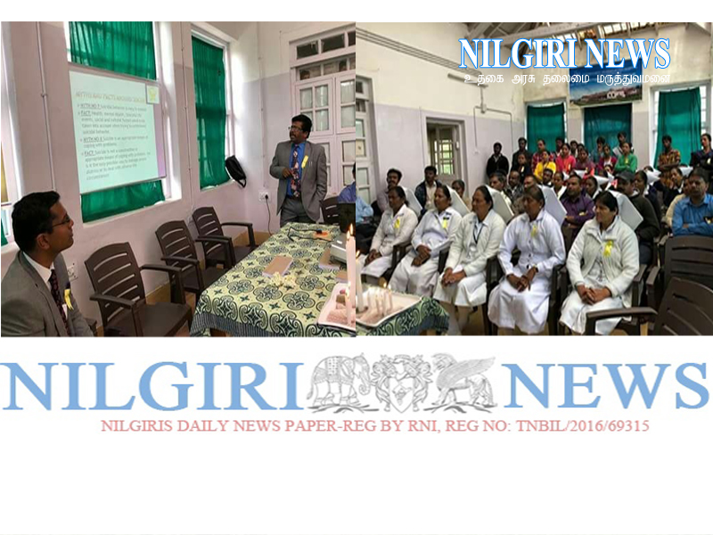 Ooty 12 Sepetember 2018 : உலக அளவிலான ஆண்டுதோறும் செப்டம்பர் 10-ஆம் தேதி உலக தற்கொலை முயற்சி தடுப்பு தினமாக (World Suicide Prevention Day ) அனுசரிக்கப்படுகிறது. உதகை அரசு தலைமை மருத்துவமனையில் உலக தற்கொலை முயற்சி தடுப்பு விழிப்புணர்வு நிகழ்ச்சி நடைபெற்றது. இதில் மருத்துவர்கள் செவிலியர்கள் மற்றும் பலர் கலந்து கொண்டனர் அளவில்- Nilgiri News